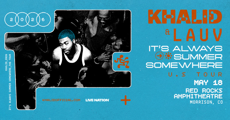 Khalid live at Red Rocks Amphitheatre — May 18, 2026. Book hotels, shuttles, and amenities through Colorado Music Travel.