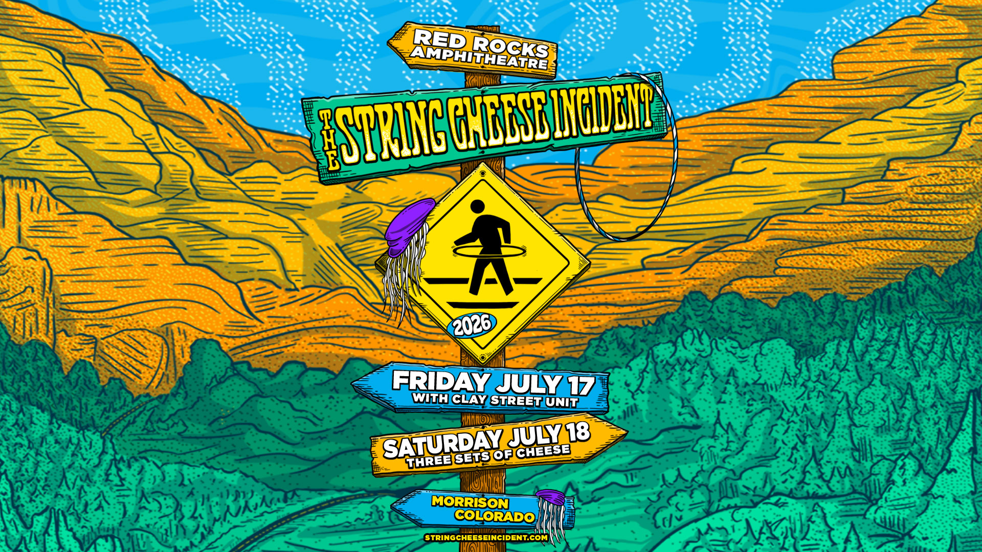 The String Cheese Incident live at Red Rocks Amphitheatre — July 18, 2026. Book hotels, shuttles, and amenities through Colorado Music Travel.